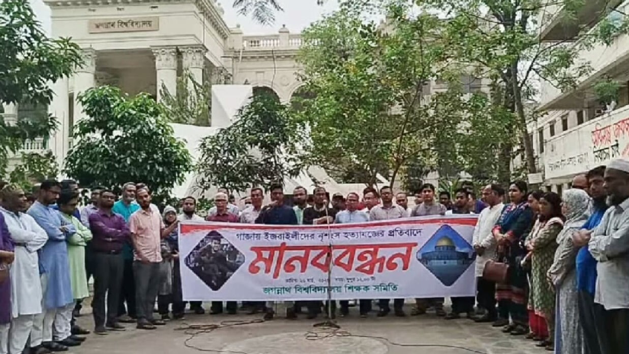 মানববন্ধনে বিশ্ববিদ্যালয়টির প্রক্টর অধ্যাপক ড. মুহাম্মদ তাজাম্মুল হক বলেন, ফিলিস্তিনিরা আজ হামলার শিকার হচ্ছে। আমাদেরও একই অবস্থা হতে পারে। তাই সবাইকে এর বিরুদ্ধে সোচ্চার হতে হবে। বাংলাদেশে বিগত বছরগুলোতে অসংখ্য ইসরায়েলি পণ্য কেনা হয়েছিল, যা দিয়ে দেশের জনগণের ওপর গুপ্তচরবৃত্তি চালানো হয়েছে। সেসব পণ্য নিষিদ্ধ করতে হবে। বিগত সময়ে যত ইসরায়েলি জাহাজ দেশে এসেছে, সবগুলোর তথ্য প্রকাশ করতে হবে।