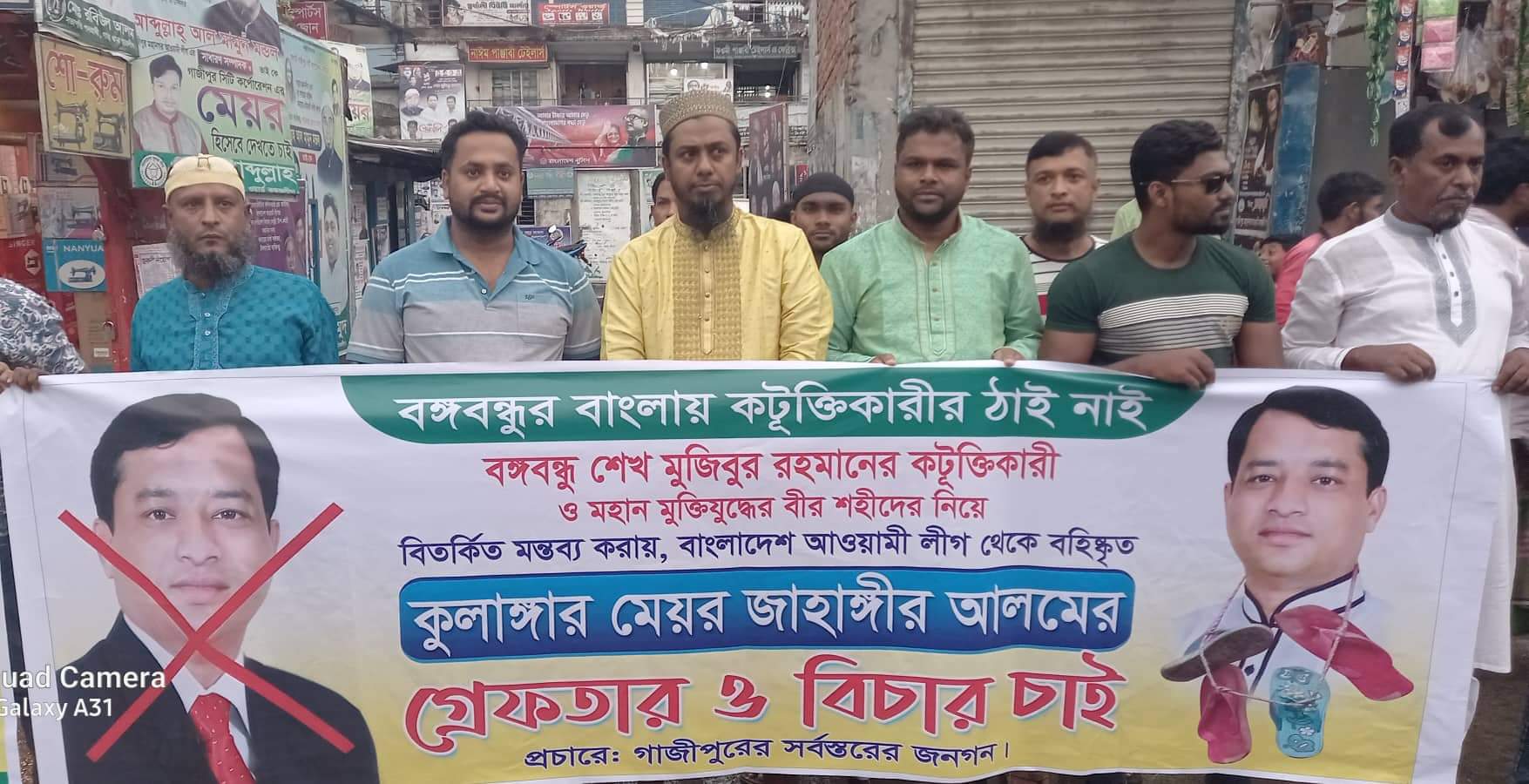 গাজীপুর মহানগরের গাছা থানাধীন ঢাকা-ময়মনসিংহ মহাসড়কের বোর্ডবাজার এলাকায় সোমবার বিকালে গাজীপুর সিটি করপোরেশনের সাময়িক বহিস্কৃত মেয়র মো. জাহাঙ্গীর আলমের গ্রেফতার ও বিচার দাবিতে মানববন্ধন করেছেন এলাকাবাসী। এ মানববন্ধনে নেতৃত্ব দেন ৩৫ নম্বর ওয়ার্ড কাউন্সিলর আব্দুল্লাহ আল মামুন মন্ডল। মানববন্ধনে অংশ নেন গাজীপুর সিটি করপোরেশনের প্যানেল মেয়র ও ৫২ নম্বর ওয়ার্ড কাউন্সিলর আব্দুল আলীম মোল্লা। বঙ্গবন্ধুর বাংলায় কূটক্তিকারীর ঠাই নাই লেখা ফেস্টুন হাতে নিয়ে প্রায় সহশ্রাধিক বিভিন্ন শ্রেণি-পেশার মানুষ অংশ নেন মানববন্ধনে। মহান মুক্তিযুদ্ধের বীর শহীদদের নিয়ে বিতর্কিত মন্তব্য করায় জাহাঙ্গীর আলমের বিচার দাবি করে বক্তব্য দেন, আওয়ামীলীগ নেতা বাবুল হোসেন মন্ডল, আমির হোসেন ভুট্রো, মহানগর মৎসজীবী লীগের সহসভপতি হালিম খান, গাছা থানা মৎসজীবী লীগ আহবায়ক নবীন হোসেন, সদস্য সচিব শামসাদ আহমেদ খান রুবেল, গাছা থানা ছাত্রলীগের সাধারণ সম্পাদক মানিক পাঠান, কৃষকলীগ নেতা আবুল হাসনাত প্রমুখ। এদিকে কুনিয়া তারগাছ, বড়বাড়ী, সাইনবোর্ড, হারিকেন এলাকায়ও এ মানববন্ধন অনুষ্ঠিত হয়।