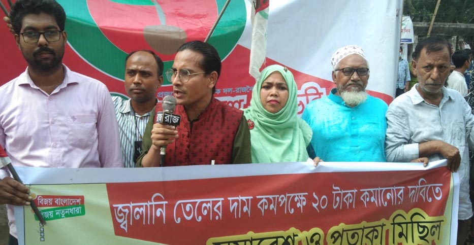 জ্বালানি তেলের দাম অস্বাভাকিভাবে বাড়িয়ে মাত্র ৫ টাকা কমানোর প্রতিবাদ ও তেলের দাম ২০ টাকা কমানোর দাবিতে সমাবেশ ও পতাকা মিছিল করেছে নতুনধারা বাংলাদেশ (এনডিবি)।