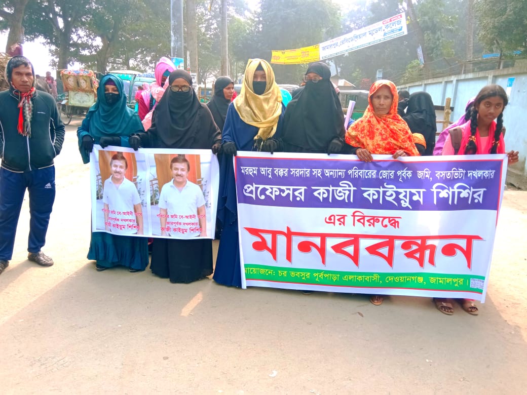 মানব বন্ধনে মোঃ সাইদুর রহমান বলেন প্রফেসর কাজী কাইয়ুম শিশির একজন জমি লোভী। সে দেওয়ানগনঞ্জ পৌরসভার চর ভবসুর এলাকায় অসহায় লোকজনের জমি জোরপূর্বক দখল করে নেয়। ভয় দেখায় হুমকি দামকি দেখায়, অত্যচার নির্যাতন করে আসছে।