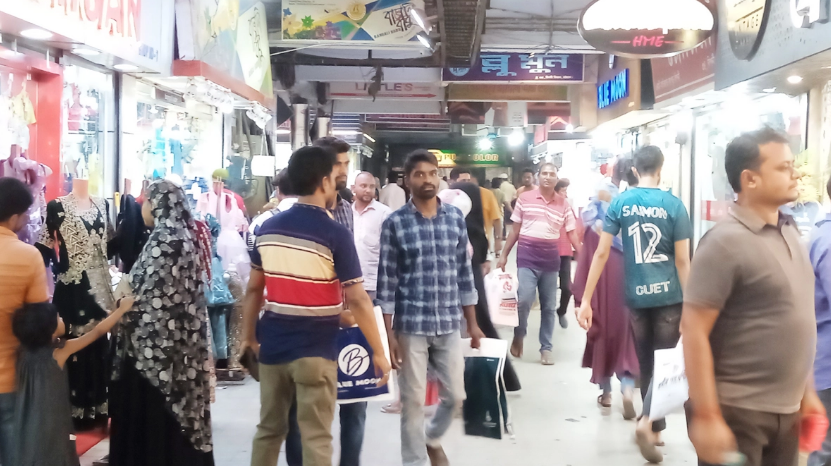 মঙ্গলবার (১৮ এপ্রিল) এই মার্কেটে প্রচুর ভিড় দেখা গেছে। বিক্রেতারা পণ্য বিক্রির জন্য সর্বোচ্চ চেষ্টা করছেন। কোনো কোনো দোকানে স্তূপ বসিয়ে পণ্যের মূল্য ফিক্সড করে ক্রেতা আকৃষ্ট করার চেষ্টা করছেন। কোনো কোনো দোকানে হাঁকডাক করে কাস্টমার ডাকা হচ্ছে।