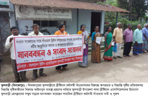 ফুলবাড়ী উপজেলা শাখা বাংলাদেশ খ্রীষ্ট্রিয়ান এসোসিয়েশনের উদ্যোগে ফুলবাড়ী প্রেসক্লাবের সম্মুখ সড়কে গতকাল শনিবার (২৯ জুন) সকাল ১০ টা থেকে ১১টা পর্যন্ত ঘন্টাব্যাপী মানববন্ধন কর্মসূচি পালন করা হয়। এতে শতাধিক খ্রীষ্টিয়ান ধর্মালম্বী বিভিন্ন বষয়সী সাঁওতাল নারী ও পুরুষ অংশ নেন।