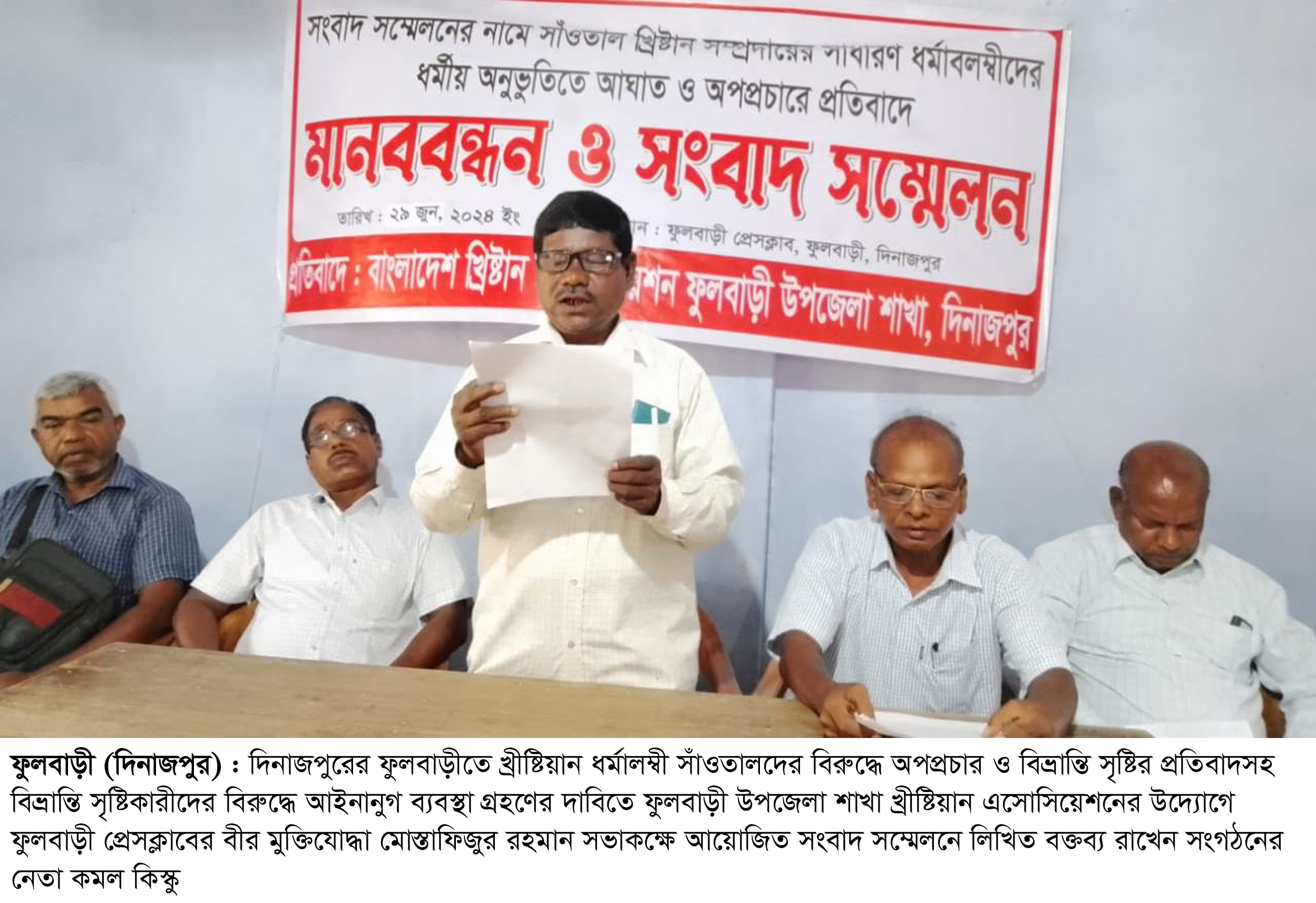 দিনাজপুরের ফুলবাড়ীতে খ্রীষ্টিয়ান ধর্মালম্বী সাঁওতালদের বিরুদ্ধে অপপ্রচার ও বিভ্রান্তি সৃষ্টির প্রতিবাদে ফুলবাড়ী প্রেসক্লাবের সম্মুখ সড়কে ঘন্টাব্যাপী মানববন্ধন কর্মসূচি পালনসহ সংবাদ সম্মেলন অনুষ্ঠিত হয়েছে।