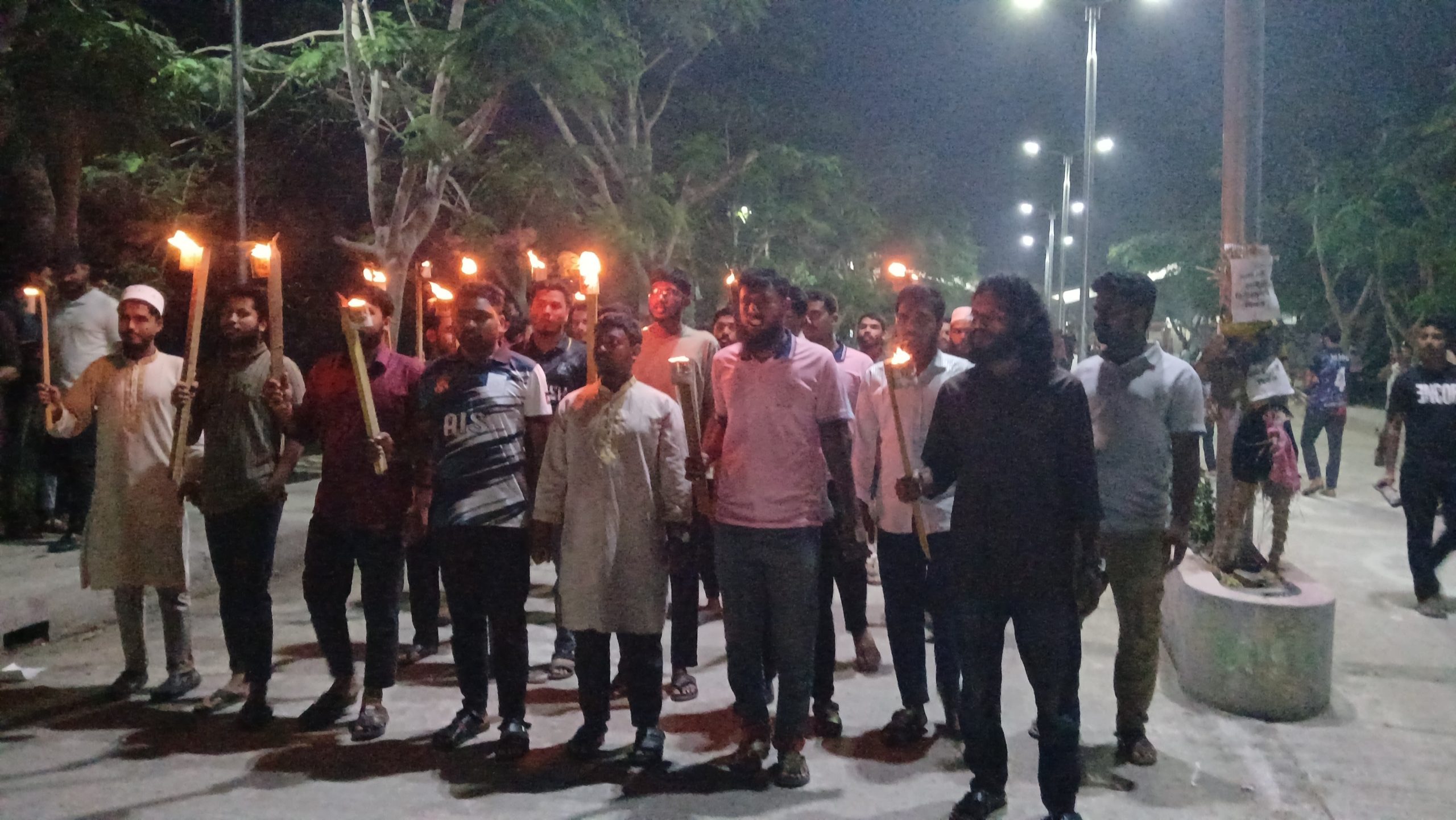 সোমবার (২১ এপ্রিল) সন্ধ্যা সাড়ে ৭টার দিকে বিশ্ববিদ্যালয়ের প্রধান ফটকের সামনে জড়ো হয়ে শিক্ষার্থীরা মশাল মিছিল শুরু করেন। এতে বিভিন্ন বিভাগের শতাধিক শিক্ষার্থী অংশগ্রহণ করেন এবং তারা একযোগে বিভিন্ন প্রতিবাদী স্লোগান দেন। স্লোগানে উঠে আসে— “আমার বোনের সম্মান ফিরিয়ে দাও”, “উই ওয়ান্ট জাস্টিস”, “যৌন হয়রানির বিরুদ্ধে ডাইরেক্ট অ্যাকশন”, “প্রশাসন জবাব চাই” প্রভৃতি।