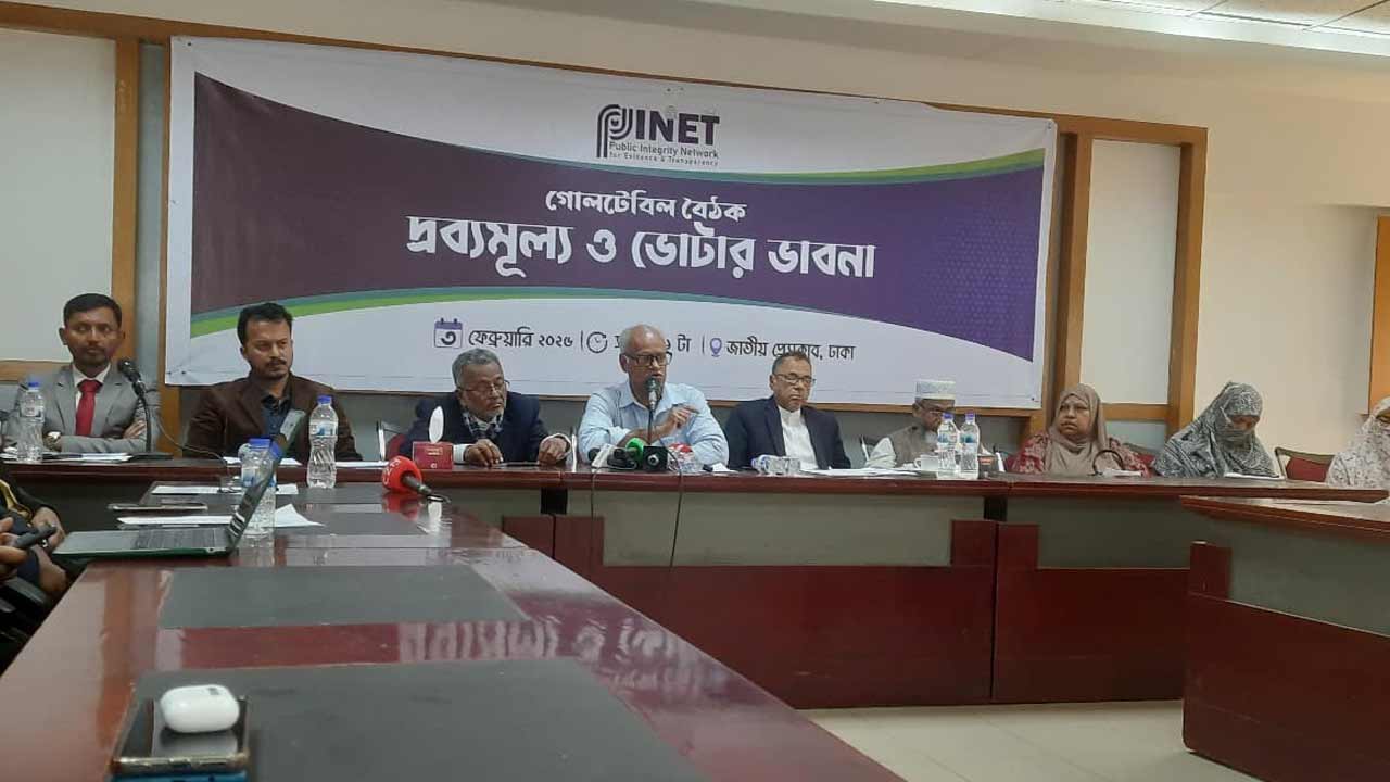 মঙ্গলবার (৩ ফেব্রুয়ারি) জাতীয় প্রেসক্লাবের তফাজ্জল হোসেন মানিক মিয়া হলে পাবলিক ইন্টিগ্রিটি নেটওয়ার্ক (পাইনেট) আয়োজিত ‘দ্রব্যমূল্য ও ভোটার ভাবনা’ শীর্ষক এক গোলটেবিল বৈঠকে বক্তারা এসব কথা বলেন। বৈঠকে সভাপতিত্ব করেন পটুয়াখালী বিজ্ঞান ও প্রযুক্তি বিশ্ববিদ্যালয়ের সাবেক উপাচার্য অধ্যাপক ড. আব্দুল লতিফ মামুন এবং মূল প্রবন্ধ উপস্থাপন করেন ঢাকা বিশ্ববিদ্যালয়ের ফিন্যান্স বিভাগের চেয়ারম্যান অধ্যাপক ড. এইচ এম মোশাররফ হোসেন।