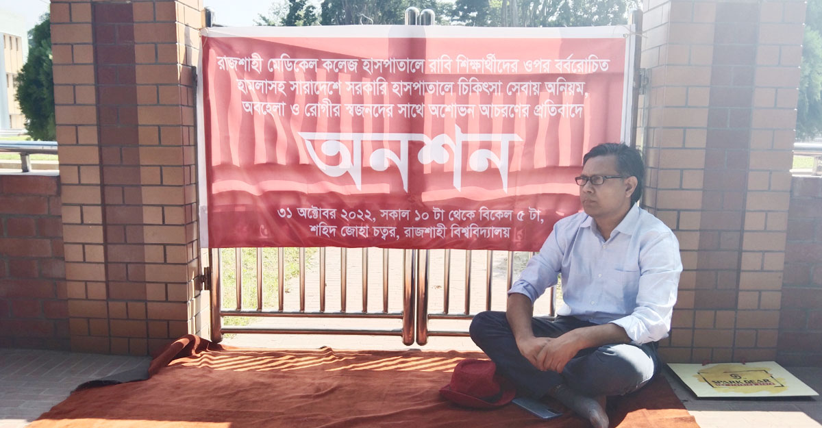 রাজশাহী মেডিকেল কলেজ হাসপাতালে রাবি শিক্ষার্থীদের ওপর হামলাসহ সারা দেশে সরকারি হাসপাতালে চিকিৎসা সেবায় অনিয়ম, অবহেলা ও রোগীর স্বজনদের সঙ্গে অশোভন আচরণের প্রতিবাদে অনশন শুরু করেছেন বিশ্ববিদ্যালয়ের অর্থনীতি বিভাগের শিক্ষক অধ্যাপক ড. মো. ফরিদ উদ্দিন খান।