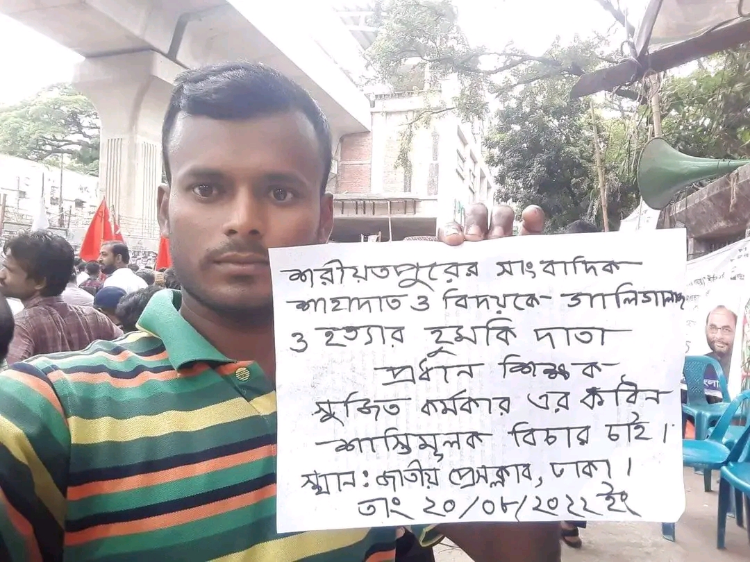শরীয়তপুরের ডামুড্যায় দুই সাংবাদিককে গালি দিয়ে ভাইরাল প্রধান শিক্ষক সুজিত কর্মকারে বিরুদ্ধে সর্বচ্চো শাস্তির দাবিতে জাতীয় প্রেসক্লাবে অবস্থান কর্মসুচি করেছে প্রতিবাদী যুবক মোহাম্মদ কাউসার মিয়া।